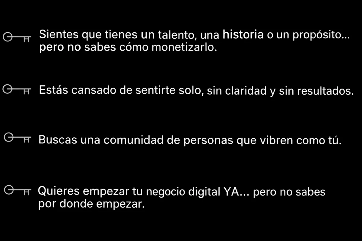 Cualquier persona interesada en crecer puede unirse. Sin embargo, está especialmente pensada para gente comprometida que quiera transformar su situación, aprender sobre negocios digitales y rodearse de una comunidad que comparte la misma visión.